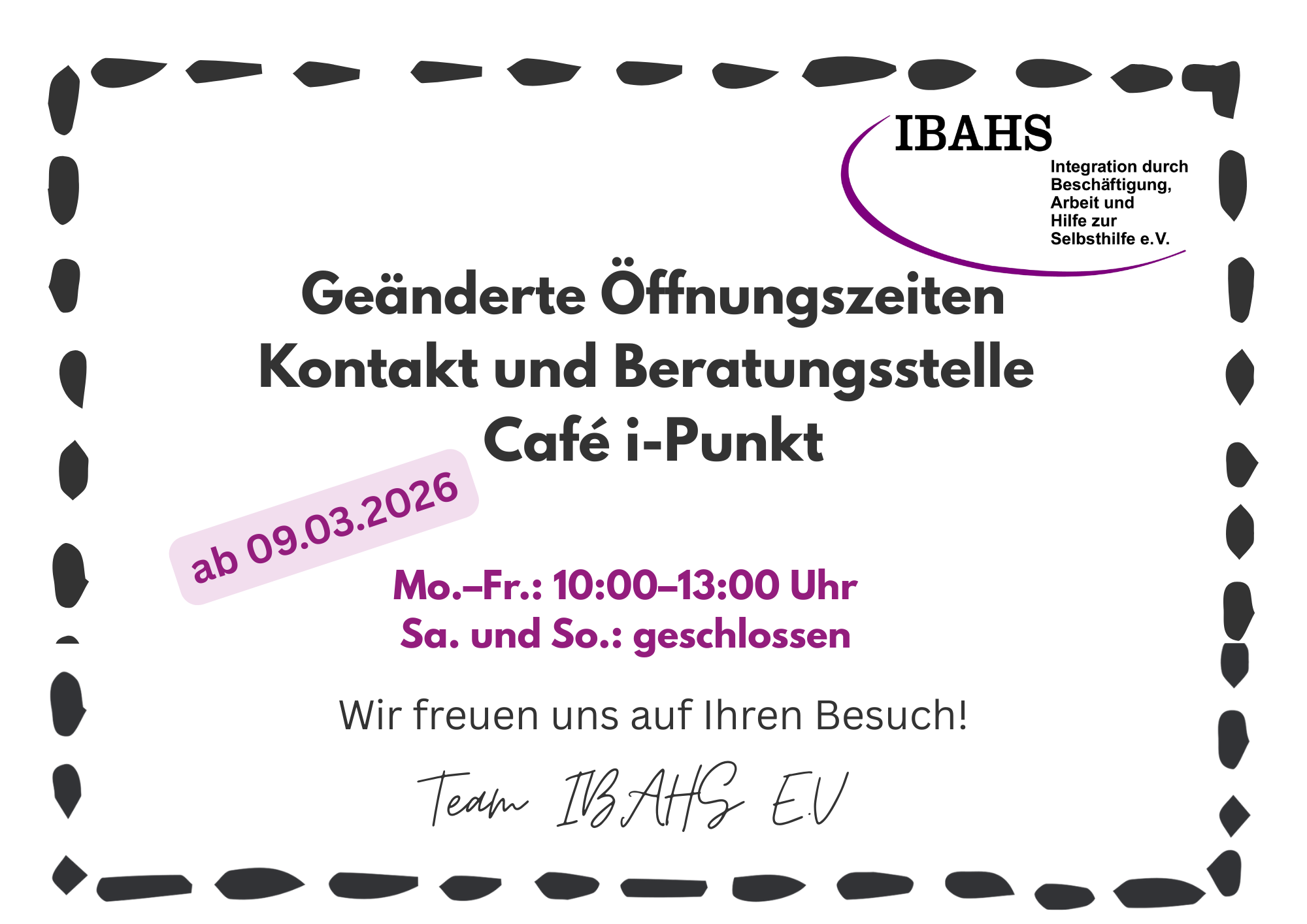 09.03.26 - Neue Öffnungszeiten Café i-Punkt Hiermit teilen wir unseren Besuchern des Café i-Punktes folgende wichtige Information mit: Weiter